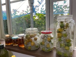 瓶ごとに砂糖の種類を変えています。はちみつを使ったものはなぜか漬けて数日後から濁りはじめました。
